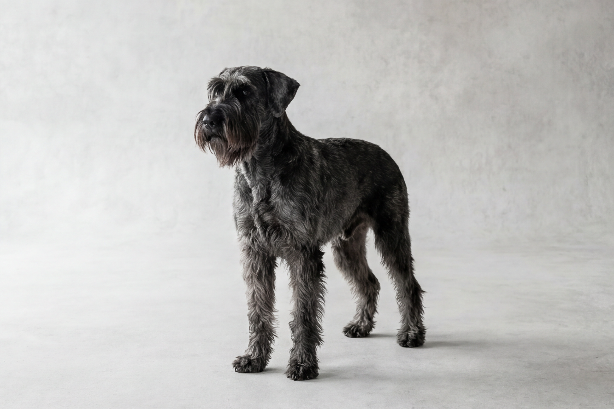 Professional grooming every 4-6 weeks with daily brushing. Their wiry coat needs regular trimming to maintain that classic schnauzer look. Regular beard cleaning and nail trims keep these large dogs looking sharp.
